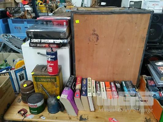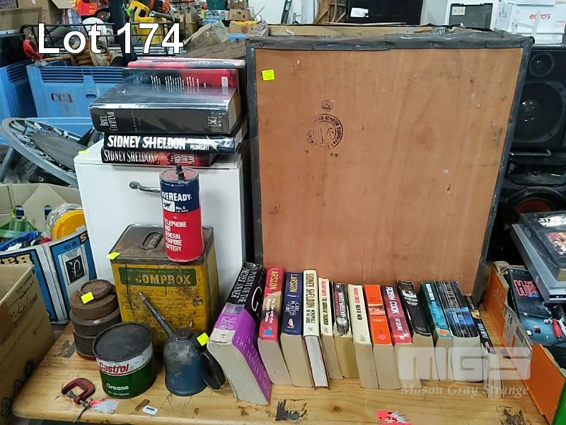 BOOKS, VINTAGE OIL TINS, SCALE WEIGHTS, BP TIN CUT IN HALF, GENUINE VINTAGE TEA CHEST & WHITE BOX