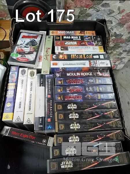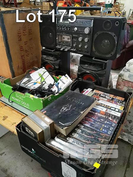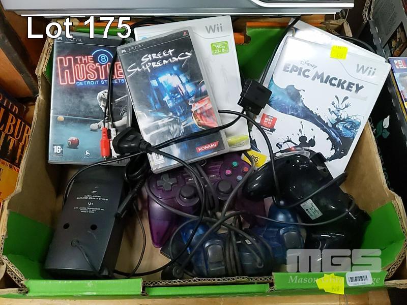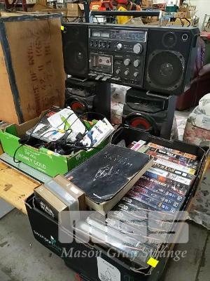 VIDEO GAMES INC PSP GAMES, PS2/3 CONTROLLERS, SANYO RETRO BOOM BOX, DVD PLAYER, VHS VIDEOS INC MAD MAX, STAR WARS
