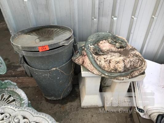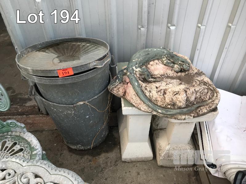 4 X CONCRETE GARDEN PEDESTALS, CONCRETE GOANNA GARDEN FEATURE & 2 X GALV RUBBISH BINS