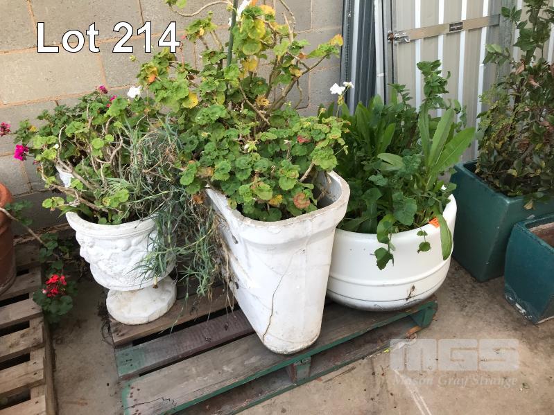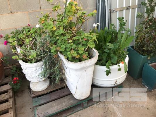 4 x POTTED PLANTS, ENAMEL POT, FIBREGLASS TUB & PAIR OF CONCRETE URNS