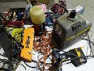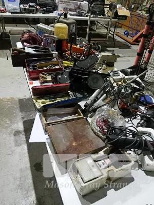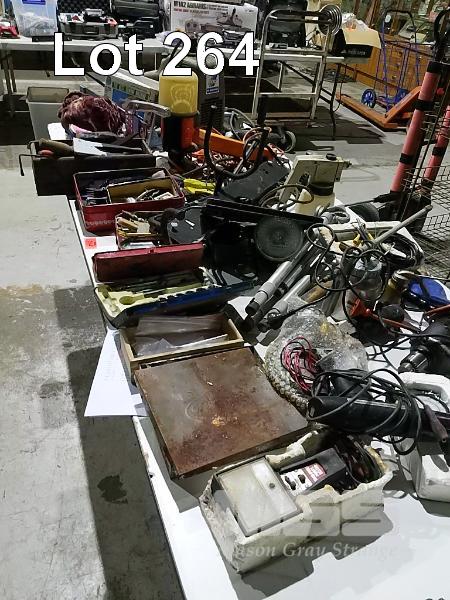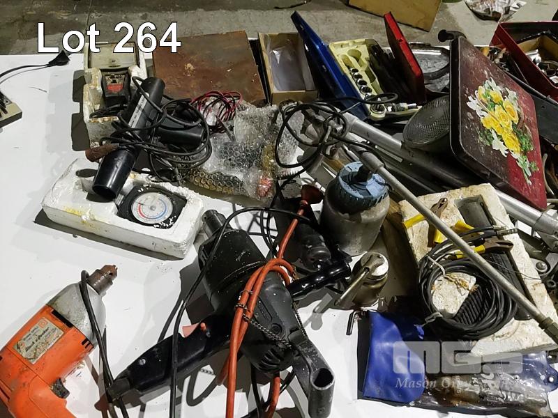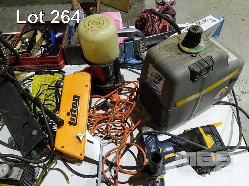 COLLECTION OF TOOLS AND OTHER WORKSHOP ITEMS INCLUDING VINTAGE ELECTRIC DRILLS, PAINT GUNS, AIR COMPRESSORS, SOCKET SETS, TILE CUTTER, BATTERY DRILLS ETC ALSO VINTAGE HOME BARBER KIT, HAIR CLIPPERS AND MORE