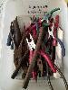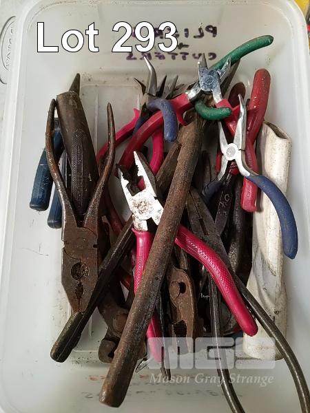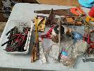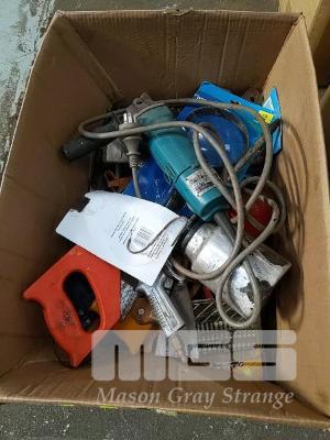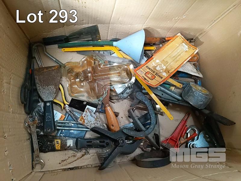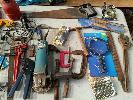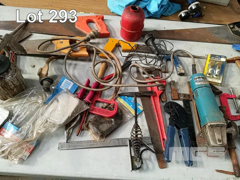 BOX OF ASSORTED OLD/NEW TOOLS & HARDWARE INCLUDING MAKITA 100MM DISC GRINDER, PLIERS, NIPS & SNIPS, SAWS, G-CLAMPS, CRIMPING TOOL, PIPE WRENCH AND MUTCH MORE