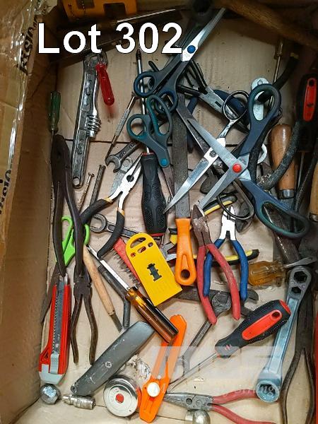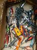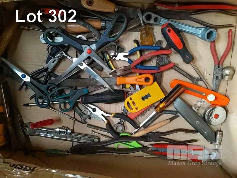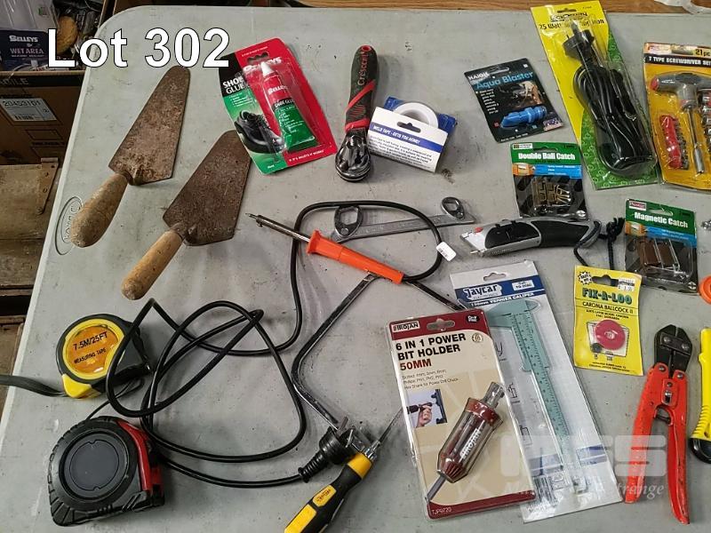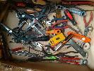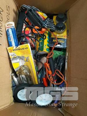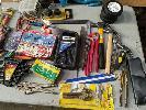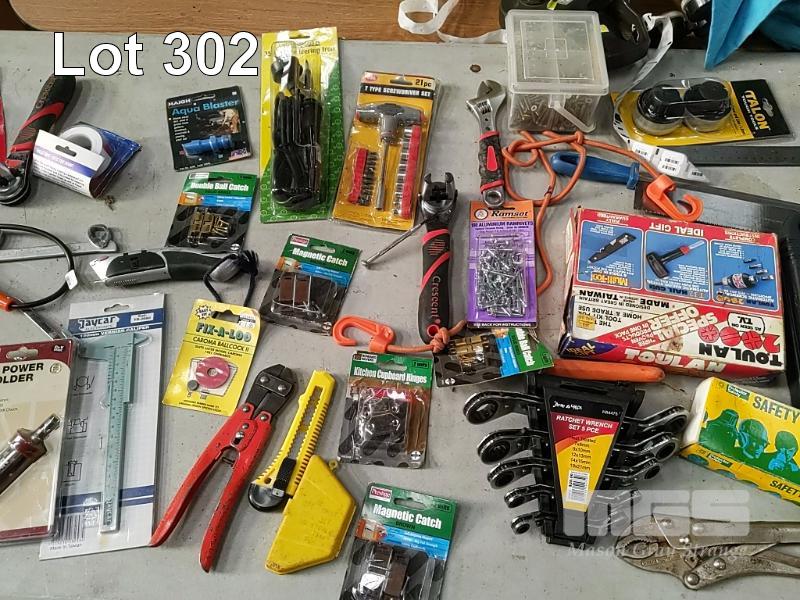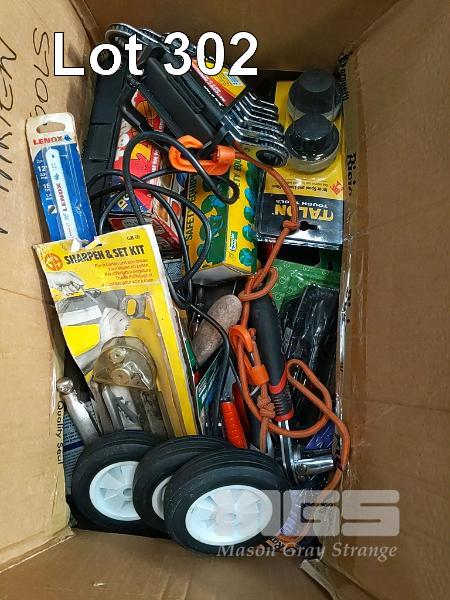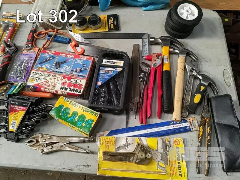 BOX OF OLD/NEW HARDWARE AND TOOLS INCLUDING RATCHET WRENCH SET TOOL, "TOULON 2000" MULTI-TOOL, MOTOR PRO SOCKET SET, TROWELS, WIRE CUTTERS, HAMMERS, FILES, SOLDERING IRONS, SCREWDRIVERS AND MUCH MORE
