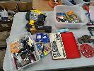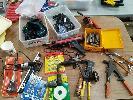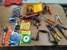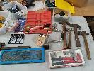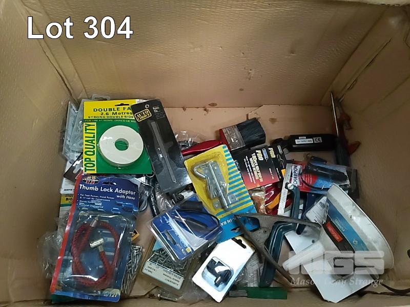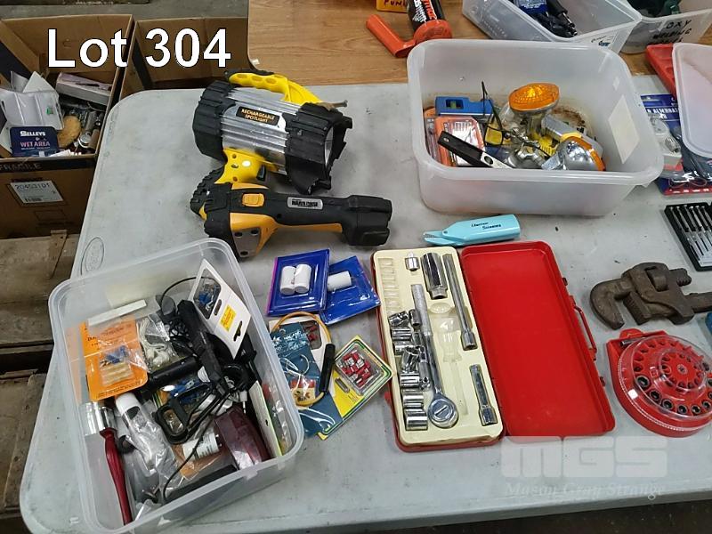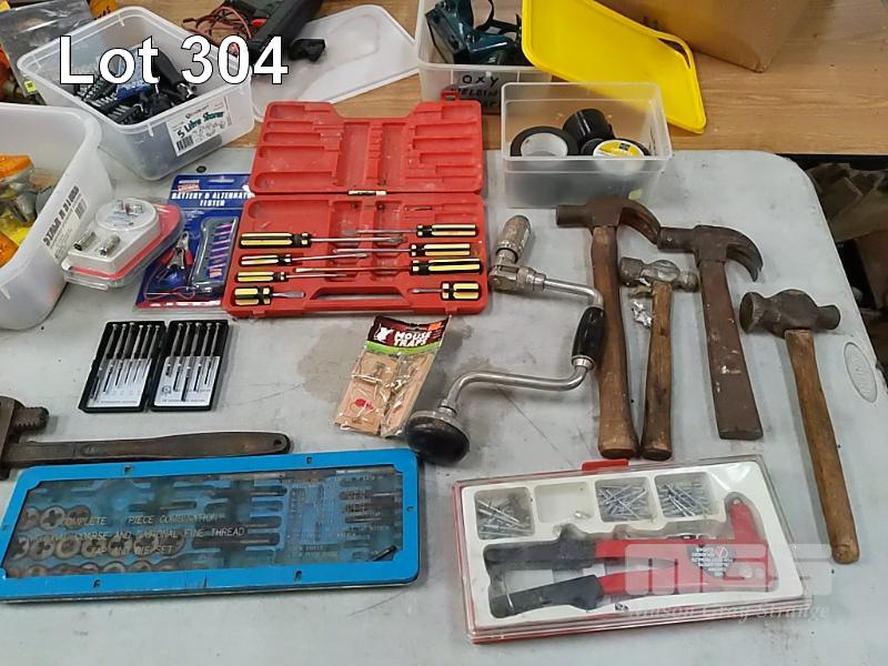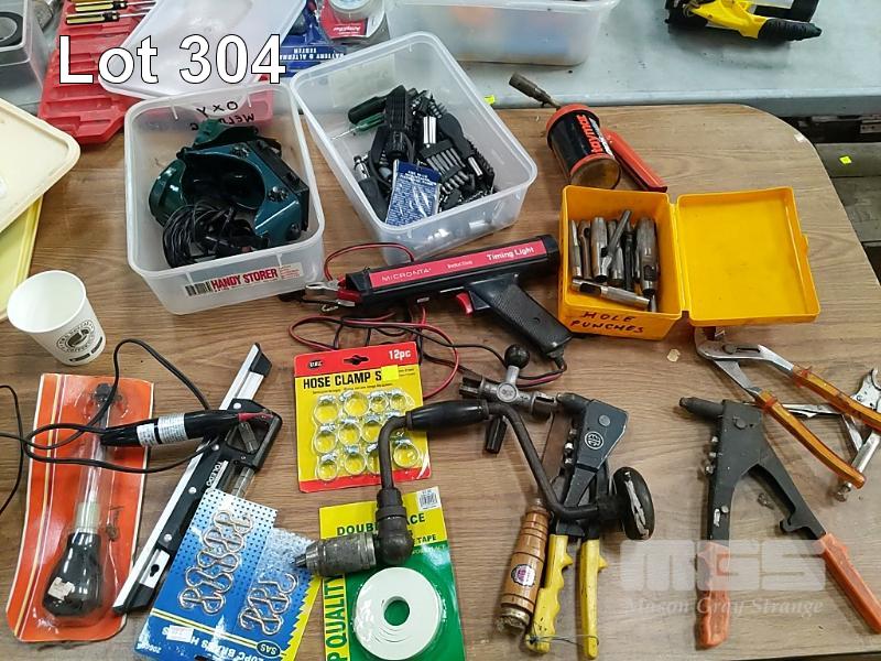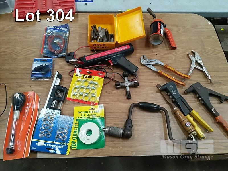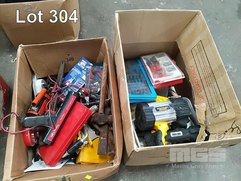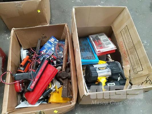 2 x BOXES OF ASSORTED OLD/NEW HARDWARE AND TOOLS INCLUDING RECHARGEABLE SPOTLIGHT, FLASHLIGHT, MICRON TA TIMING LIGHT, OXY WELDING MASKS, HAND DRILLS,, STILLSON PIPE WRENCH, OLD HAMMERS AND MUCH MORE