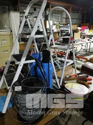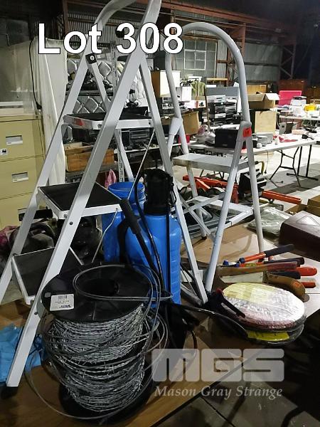 STEP LADDERS BACKPACK SPRAY UNIT, GARDEN IMPLEMENTS BARB WIRE ROLLS ETC