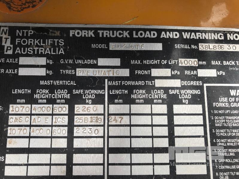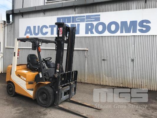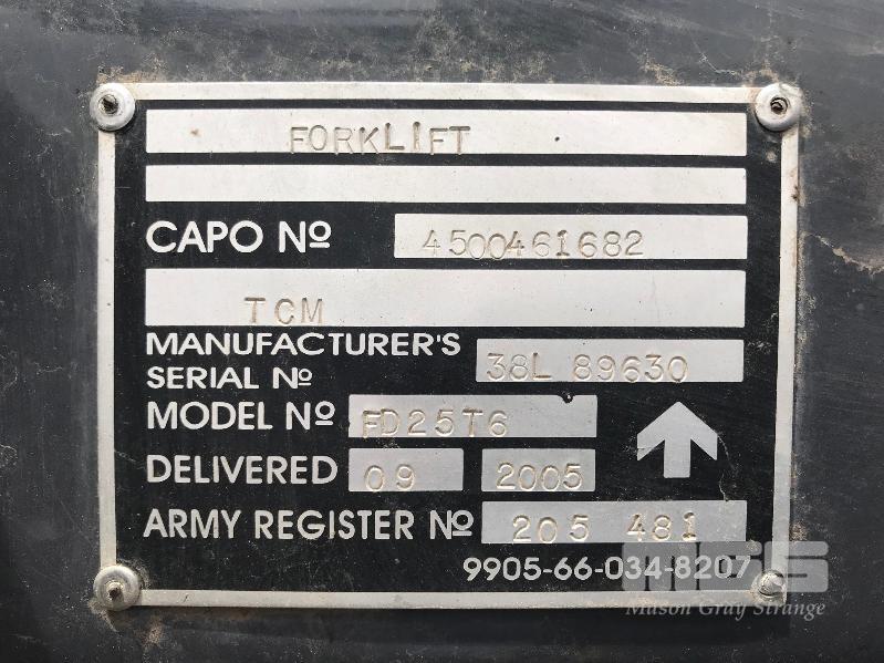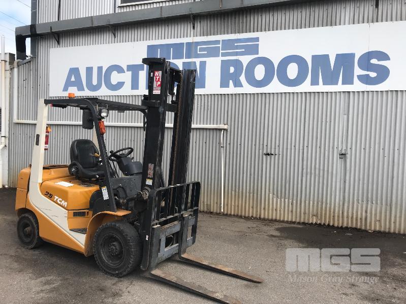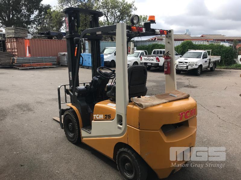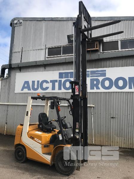 FORKLIFT, TCM MOD: FD25T6 HOURS: 693 INDICATED 4 CYLINDER ISUZU DIESEL 2 STAGE CLEARVIEW MAST SIDE SHIFT LIFT CAP: 2,280kg DIGITAL LOAD SCALE MAX LIFT HEIGHT: 400cm SOLID TYRES KEY #11