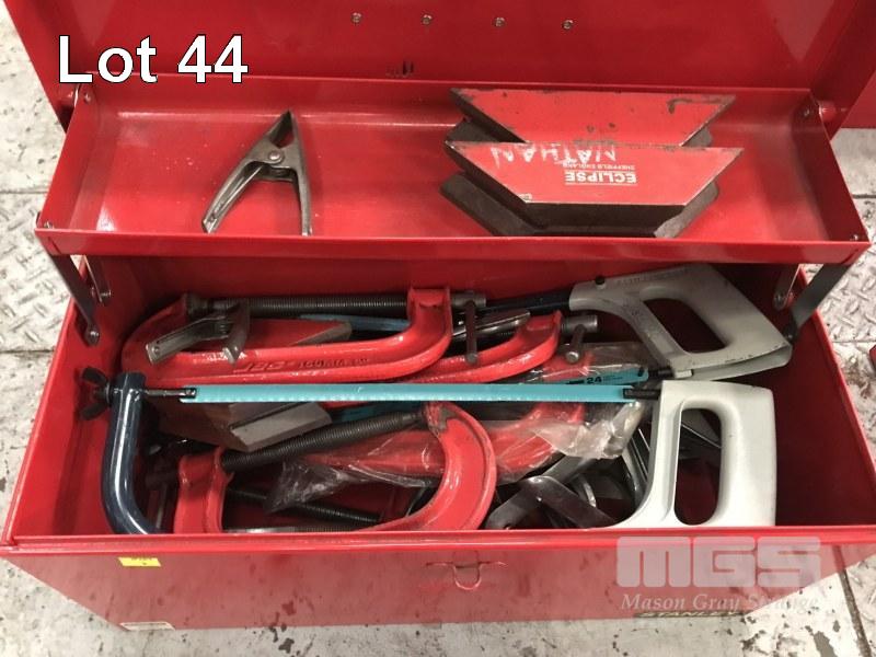 BOILERMAKERS TOOL KIT, BTK044 STANLEY TOOL BOX & CONTENTS INC MAGENTIC SQUARES, HACKS AWS, G-CLAMPS, TIN SNIPS, ETC