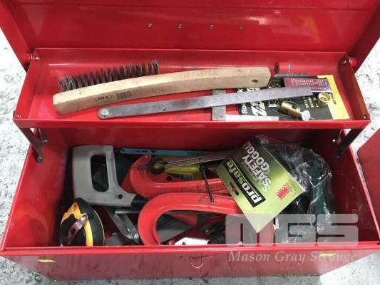 BOILERMAKERS TOOL KIT, BTK096 STANLEY TOOL BOX & CONTENTS INC DIVIDERS, MEASURES, G-CLAMPS, CHIPPING HAMMER, FILES, TIN SNIPS, MAGNETIC SQUARES, ALLEN KEYS, WIRE BRUSH, CHALK LINE, ETC