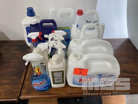 ASSORTED CLEANING CHEMICALS, INCL AJAX 5 LITRE, MORNING FRESH 5 LITRE, WINDEX, DOMESTOS, ETC.