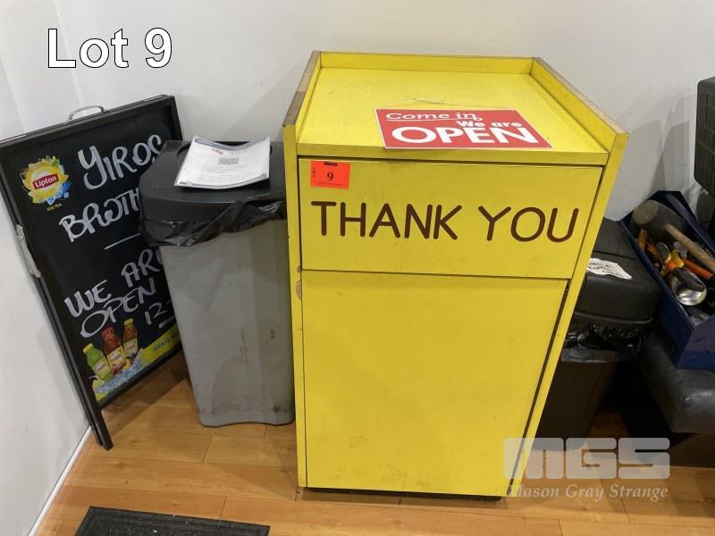 "THANK YOU" RUBBISH BIN SURROUND, A FRAME SIGN & 2 x PVC BINS & EMPTY BOTTLES