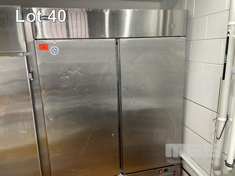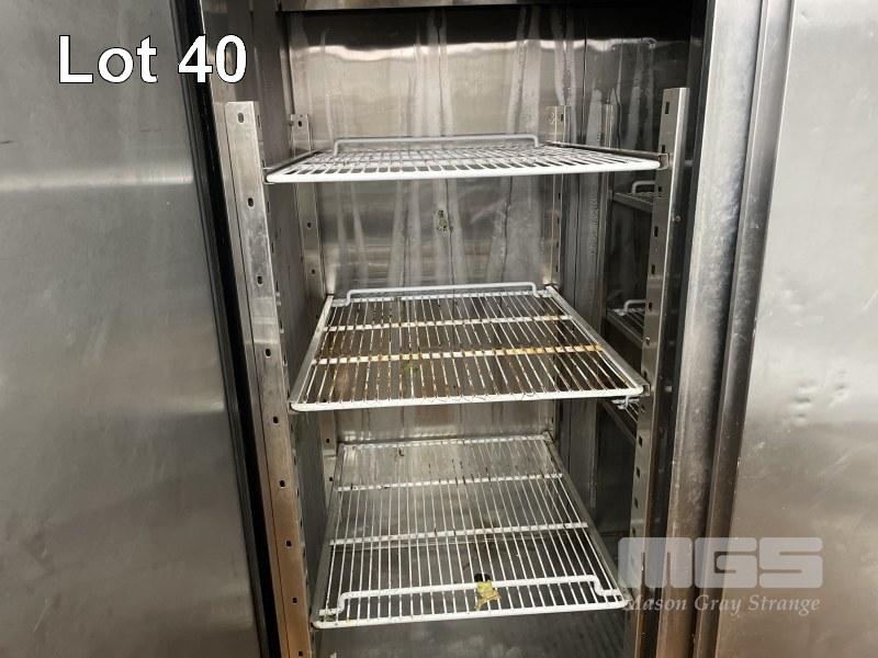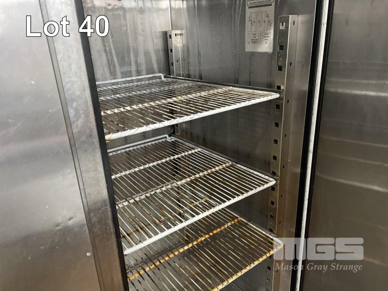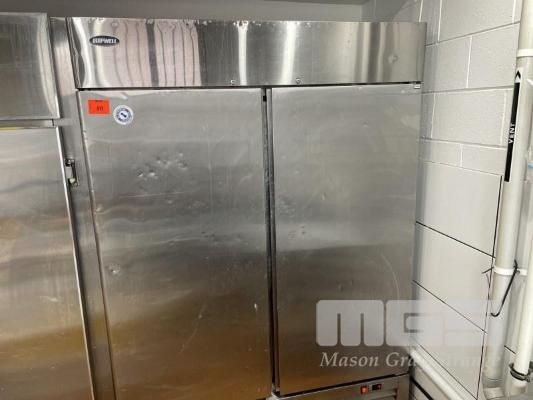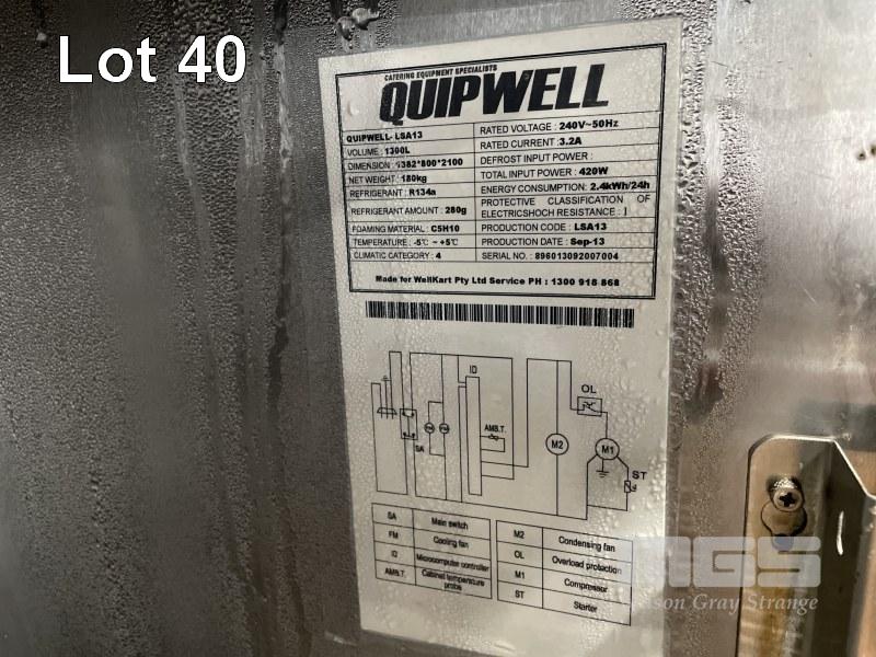 UPRIGHT CHEFS FRIDGE, 2 DOOR, QUIPWELL MOD: LSA13 DOM: 2013 1300 LITRE CAPACITY 1380 x 2100 x 800mm STAINLESS STEEL CASED WITH RACK SHELVING TEMP RANGE -5 TO +5 DEG BUILT IN REFRIGERATION (WORKING)