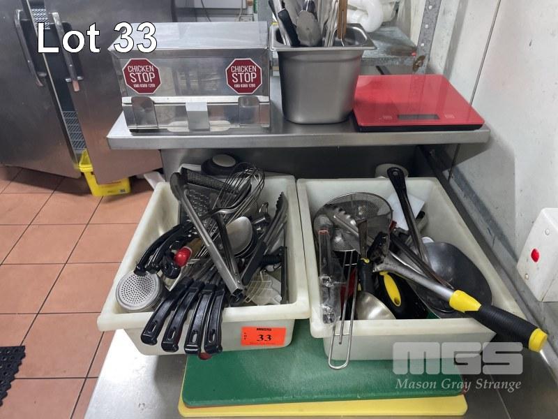 QTY OF COOKING UTENSILS TONGS, SCRAPERS, SPOONS, LADLES, SCALES, CUTTING BOARDS, ETC.