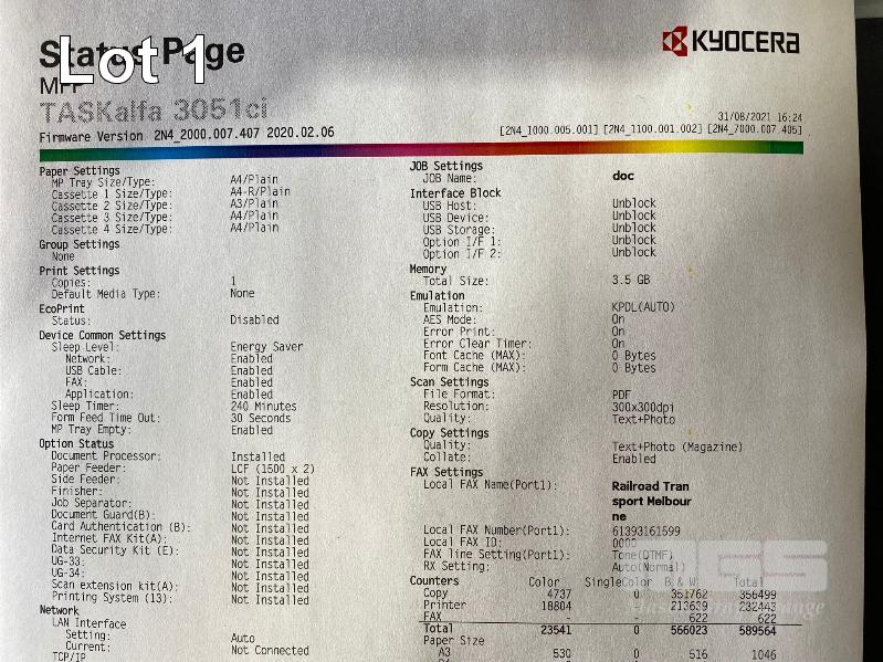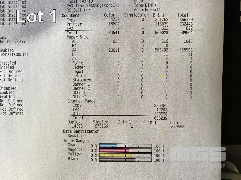 PHOTOCOPIER, KYOCERA TASKALFA 3051ci COLOUR, ADF, PRINTER USB & NETWORK PORTS, 23,542 COLOUR & 566,023 B&W COPIES SHOWING (TEST PAGE ATTACHED) S/N:1102L63AS0