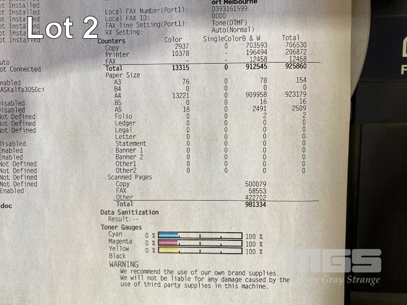 PHOTOCOPIER, KYOCERA TASKALFA 3050ci COLOUR, ADF, PRINTER USB & NETWORK PORTS, 13,316 COLOUR & 912,545 B&W COPIES SHOWING (TEST PAGE ATTACHED) S/N:1102LK3AS0