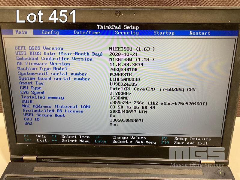 LAPTOP, LENOVO THINKPAD P50 MOBILE WORKSTATION (20EQS3BT0B), CORE i7 6820HQ (6TH GEN) @ 2.7GHz, 16GB DDR4 RAM, 256GB SSD, 15.6" WIDESCREEN (1920x1080), 4GB NVIDIA QUADRO M2000M VIDEO, Wi-Fi, BLUETOOTH, WINDOWS 10 PRO INSTALLED & POWER SUPPLY (NOTE: WHITE SPOT SCREEN BLEMISH) S/N:PC0GPXTG