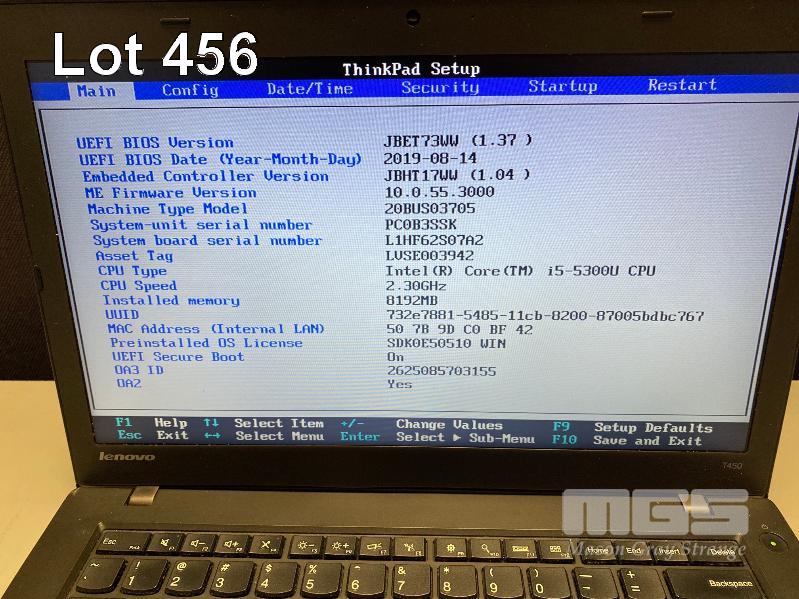 LAPTOP, LENOVO THINKPAD T450 (20BUS03705), CORE i5 5300U (5TH GEN) @ 2.3GHz, 8GB DDR3 RAM, 525GB SSD, 14" WIDESCREEN (1366x768), INTEL HD VIDEO, Wi-Fi, BLUETOOTH, WINDOWS 10 PRO INSTALLED & POWER SUPPLY S/N:PC0B3SSK