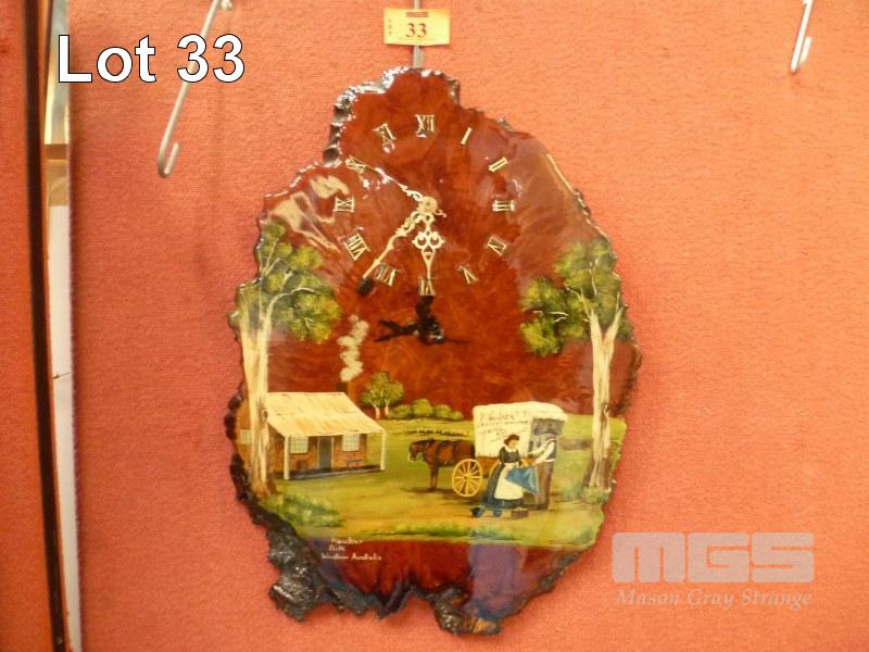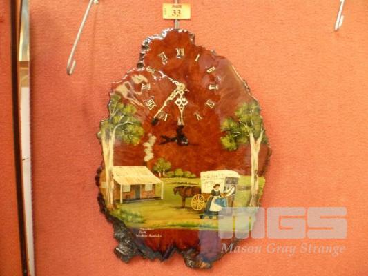 MALLEE CROSS CUT WALL CLOCK, HAND PAINTED & VARNISHED DEPICTING HAWKER, PERTH W.A, BATTERY OP, LOOSE HANDS