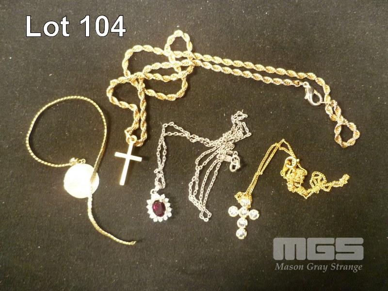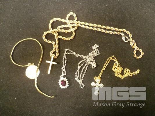 3 x GOLD PLATED CHAINS WITH PENDANTS, 1 x SILVER COLOURED CHAIN WITH RED STONE PENDANT