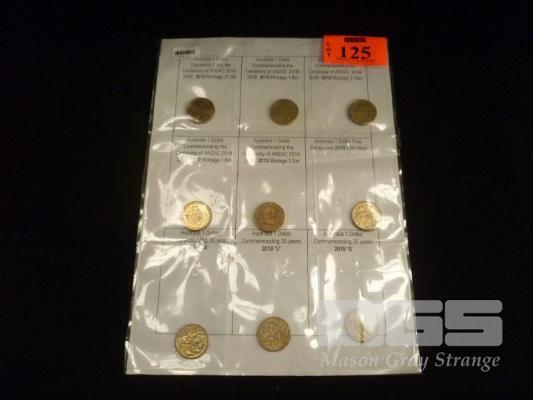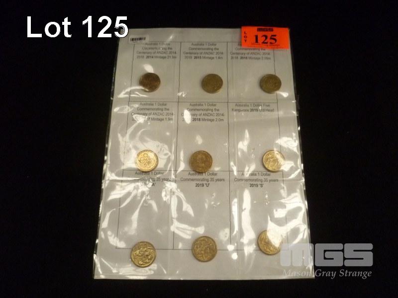 9 X AUSTRALIA COLLECTABLE $1 COINS, INC; CENTENARY OF ANZAC 2014-2019, COMMEMORATING 35 YEARS, 2019, A,U,S MINT MARKS