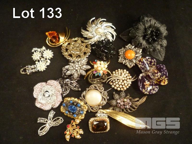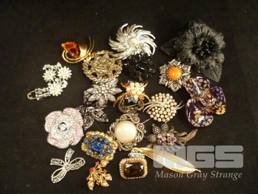 23 x ASSORTED BROOCHES, MARCASITE, GOLD PLATED, COLOURED STONE, PEARL LOOK, ETC