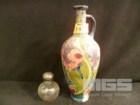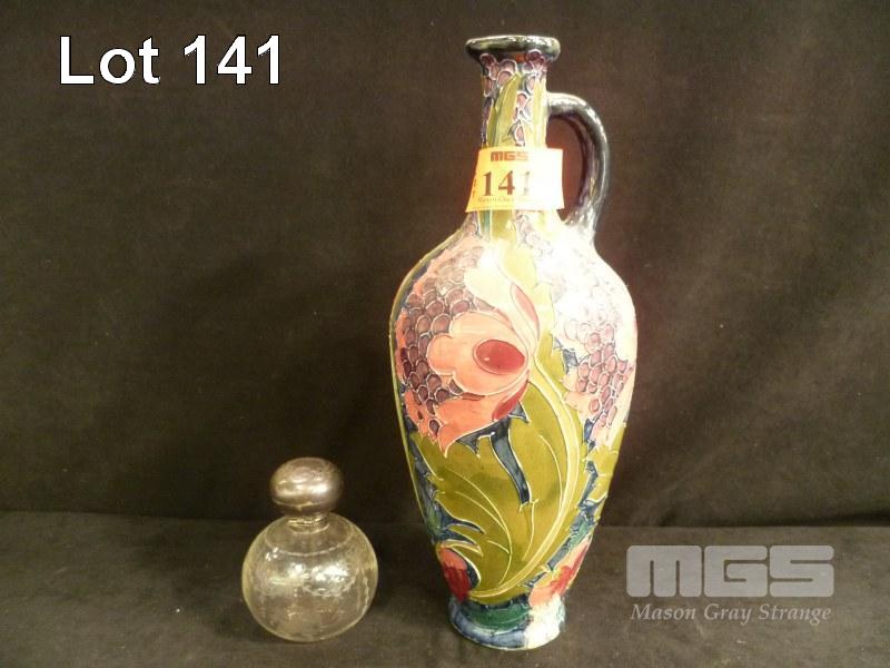 MOORECROFT STYLE JUG (ALL FAULTS) & SILVER LIDDED ETCHED GLASS BOTTLE