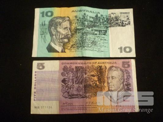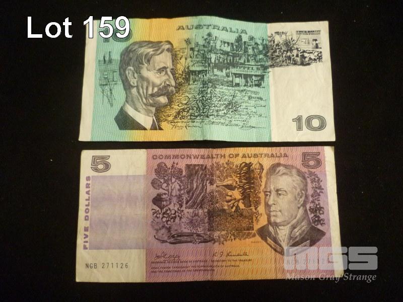 COMMONWEALTH OF AUSTRALIA $5.00 PAPER BANK NOTE, PHILLIPS/RANDALL, NGB271126 & AUSTRALIAN $10.00 PAPER BANK NOTE, FRASER/COLE, MLN023715