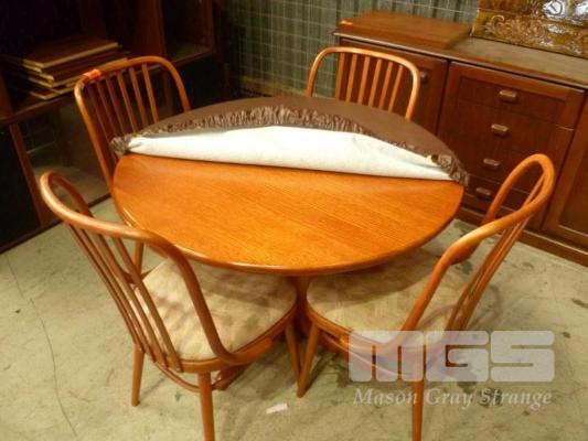 TIMBER 5 PIECE DINING SUITE INC ROUND TABLE, SINGLE PEDESTAL & 4 x CURVED BACK DINING CHAIRS