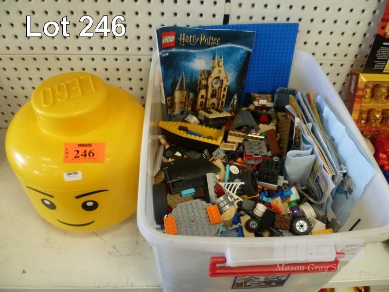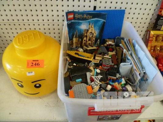 ASSORTED LEGO BLOCKS, BOOKLETS & HEAD CONTAINER