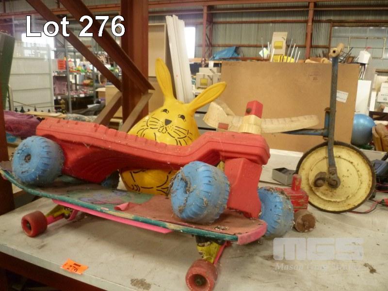 VINTAGE TRICYCLE, SKATEBOARD, WOODEN TRAIN, PLASTIC TRICYCLE, ETC