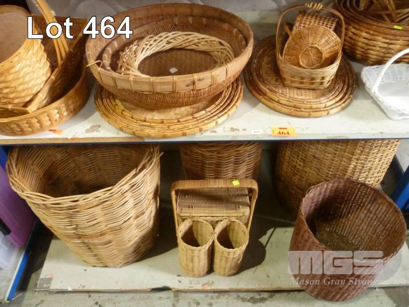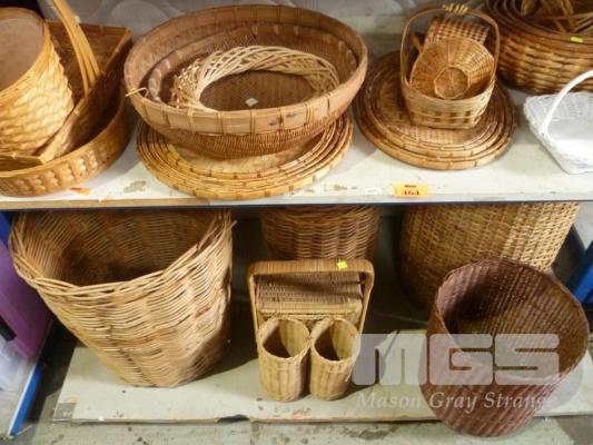 ASSORTED WICKER BASKETS, TRAYS, 2ETC, 2 x SHELVES