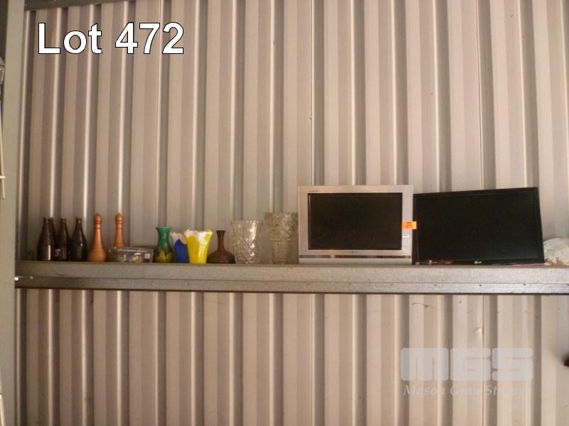 2 x LCD TVS, 17 & 22", LG WITH BUILT IN DVD, CUT CRYSTAL VASES, ART GLASS HANDKERCHIEF VASE, PICKAXE BOTTLES, ETC
