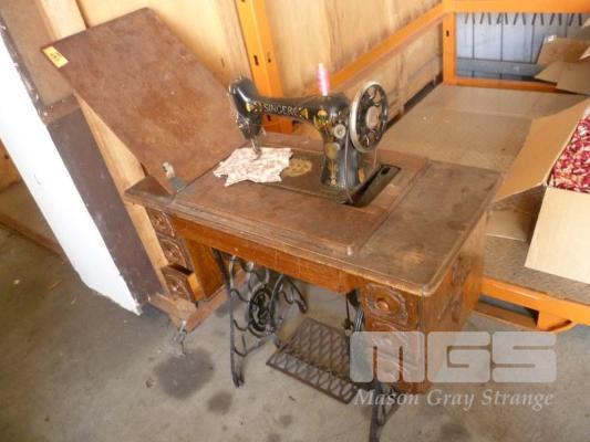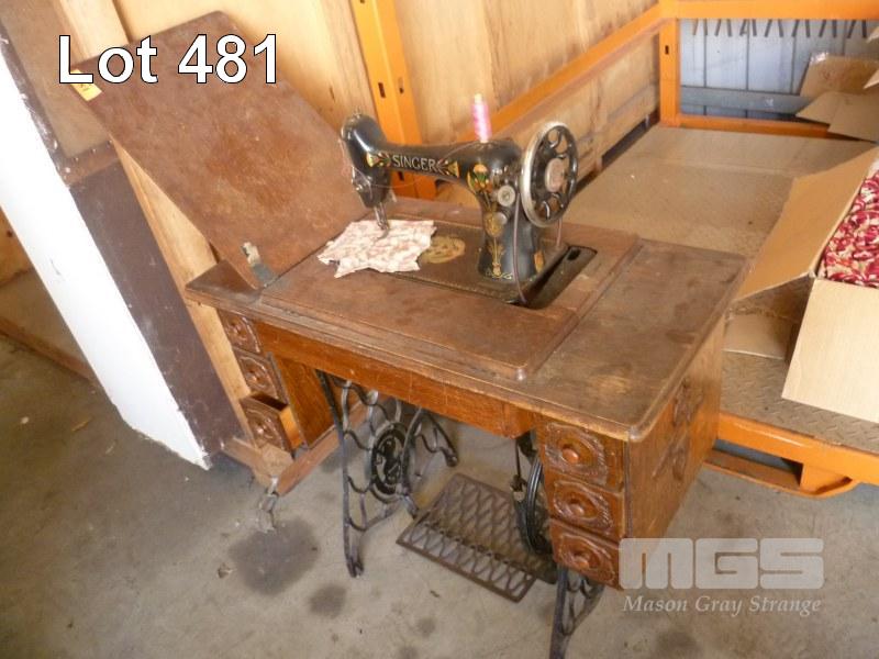 VINTAGE SEWING TABLE, 6 DRAWER WITH CAST LEGS & SINGER SEWING MACHINE