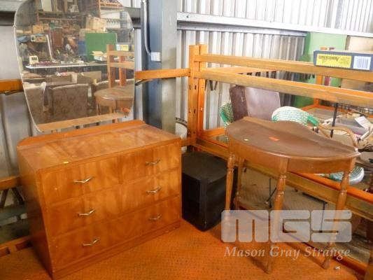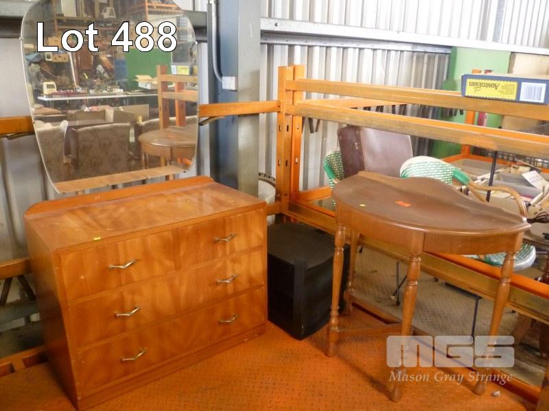 TIMBER HALL TABLE, DECO MIRROR BACKED DRESSER & SMALL ENTERTAINMENT UNIT