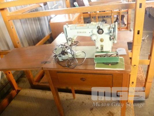 VINTAGE SINGER SEWING MACHINE ON TIMBER SINGLE DRAWER SEWING TABLE WITH SEWING SUPPLIES & MANUAL