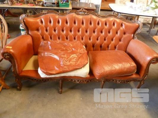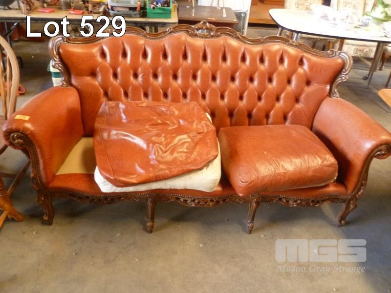 BURGUNDY LEATHER UPHOLSTERED DEEP BUTTON LOUNGE WITH DECORATIVE TIMBER FRAME, CUSHION ALL FAULTS