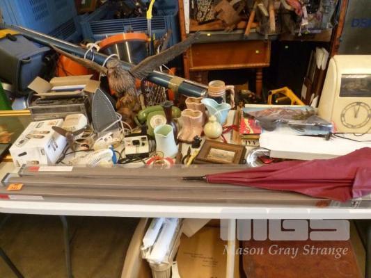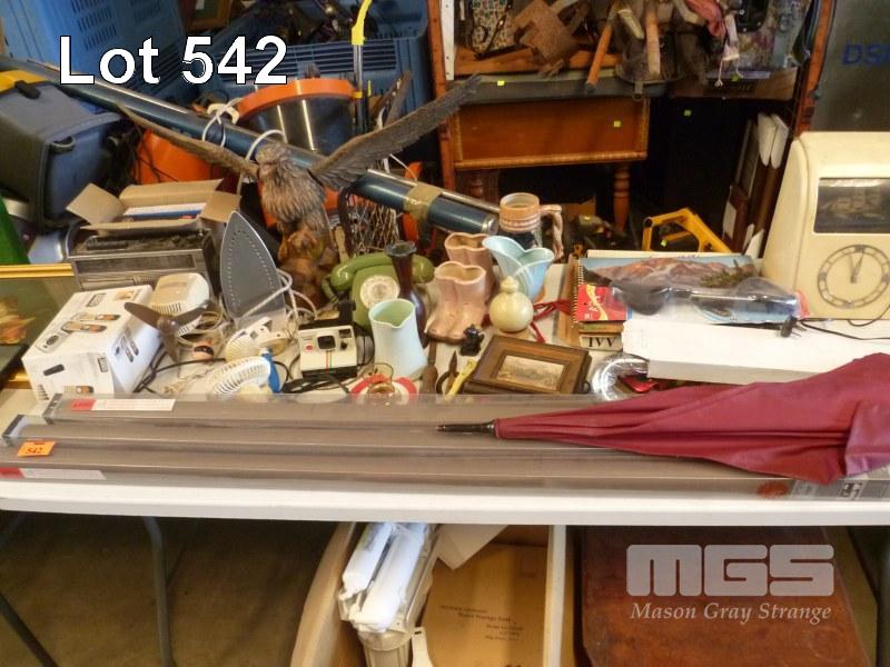 BLOCK OUT BLINDS, CARVED TIMBER EAGLE, DIAL TELEPHONE, VILASCOPE WALL CLOCK, ETC