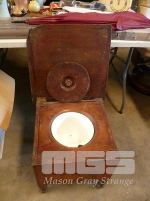 VINTAGE TIMBER CASED COMMODE WITH CERAMIC BOWL (CHIPPED) & LID