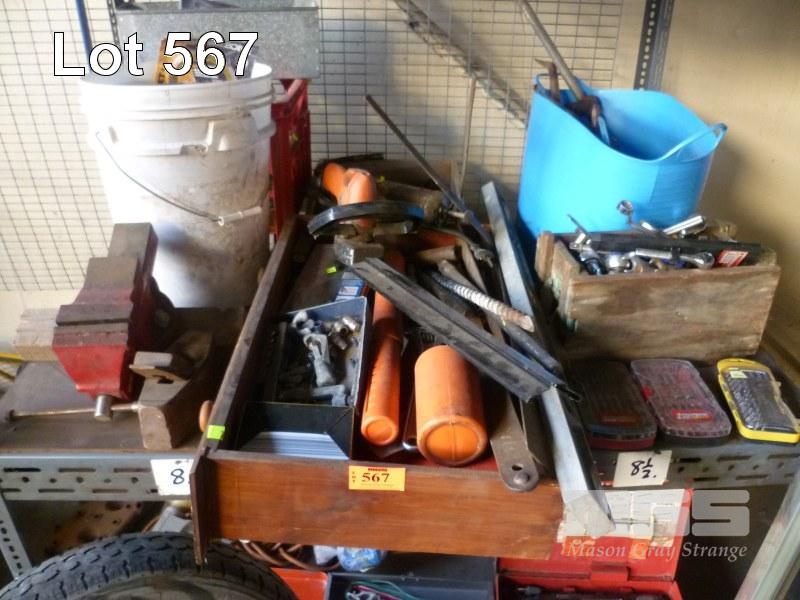 BENCH VICE, VINTAGE WOOD PLANES, BIT SETS, SOCKET SETS, HEDGE TRIMMER, ETC