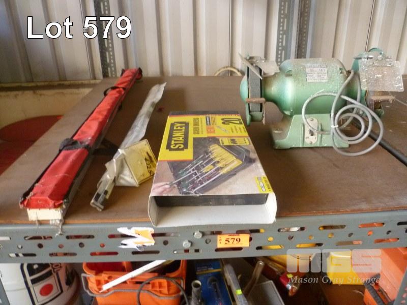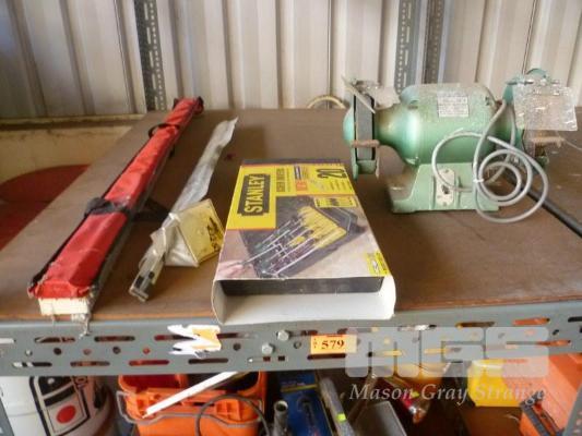 STURDEE DOUBLE ENDED GRINDER, STANLEY SCREWDRIVER SET & 2 x SPIRIT LEVELS