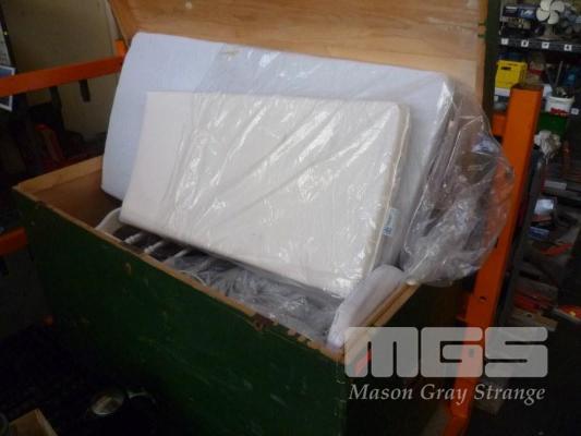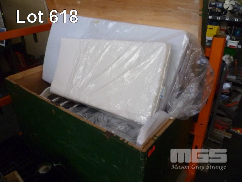 LARGE GREEN TIMBER TRAVEL TRUNK, TIMBER COT & SMALL MATTRESSES