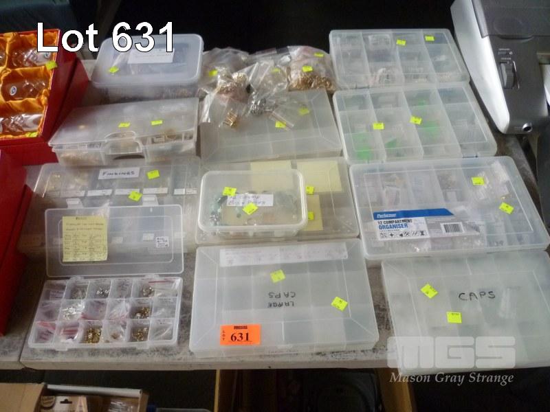 JEWELLERY CRAFT SUPPLIES INC SILVER, GOLD PLATED & COSTUME PIECES, EARRINGS, CHARMS, PENDANTS, LINKS, CLASPS, CAPS, RINGS, SEMI PRECIOUS POLISHED STONES. JASPER, MALACHITE, LAZULI, ETC, JEWELLERS TOOLS & MAGNIFYING HEAD MOUNT, ADHESIVES & CONSUMABLES CONTENTS 11 x PART BOXES & 2 x CARDBOARD BOXES