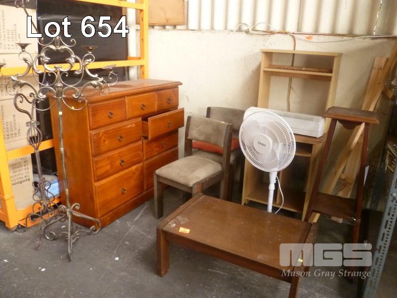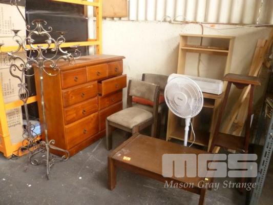 PINE TALLBOY, 9 DRAWER, PC DESK, 2 x DINING CHAIRS, PEDESTAL, COFFEE TABLE, ONIX FAN, WALL MOUNT HEATER, ETC
