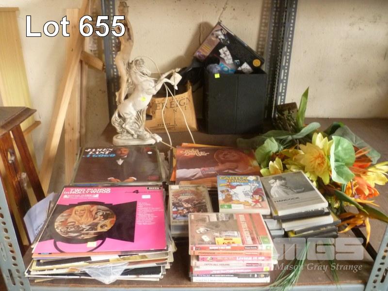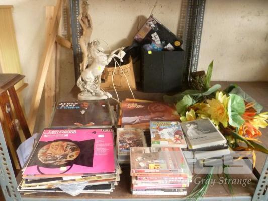 ASSORTED VINYL ALBUMS, DVD'S, TABLE LAMP, ETC