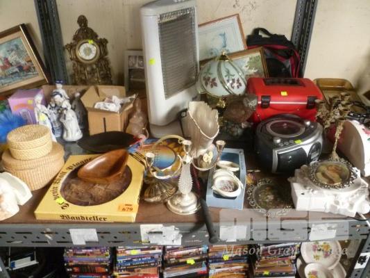 ASSORTED FIGURINES, PORTABLE CD PLAYER, HEATER,CLOCK, TABLE LAMP, ETC