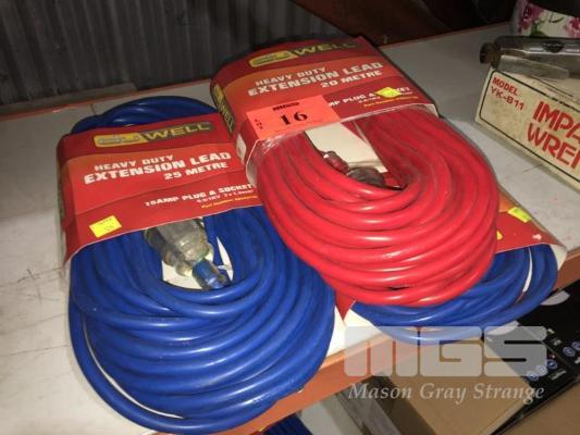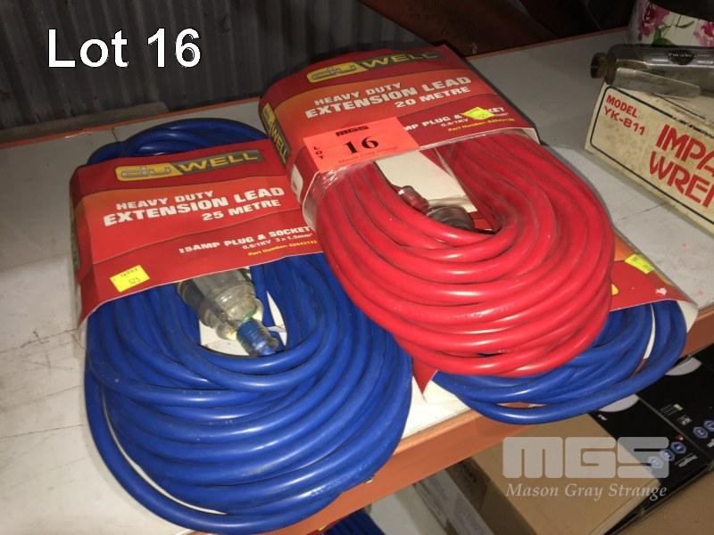 ELECTRICAL EXTENSION CORDS, 240V, 15 AMP, 2 x 25m BLUE & 10 AMP, 1 x 20m RED