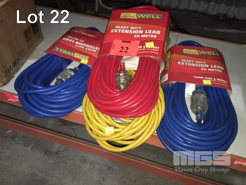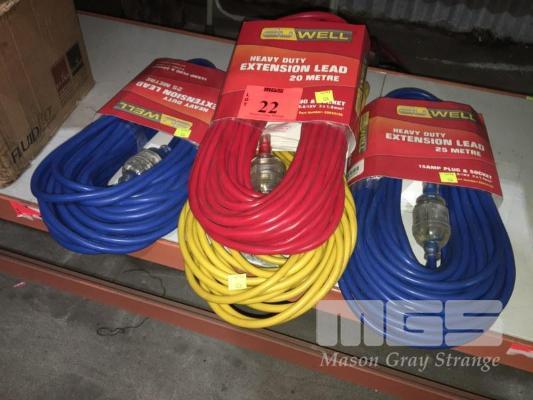ELECTRICAL EXTENSION CORDS, 240V, 15 AMP, 2 x 25m BLUE & 10 AMP, 2 x 20m RED & YELLOW