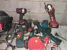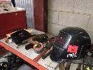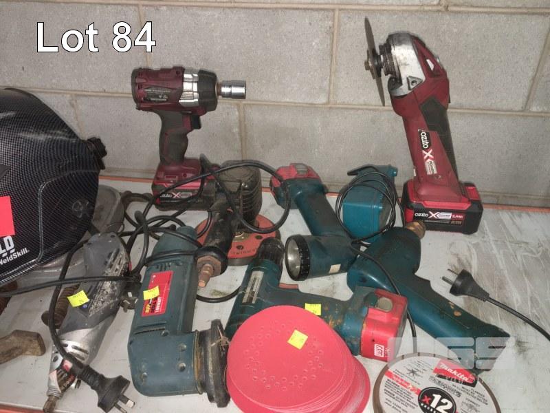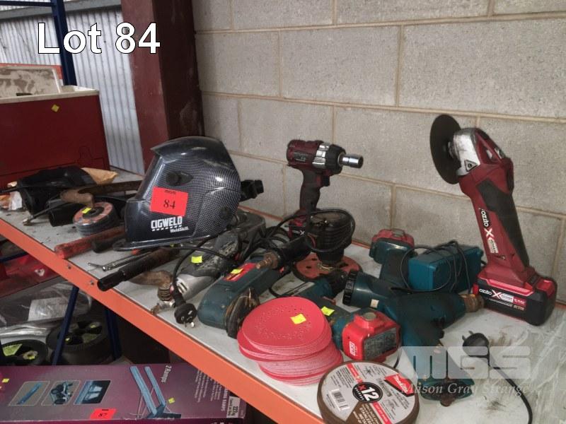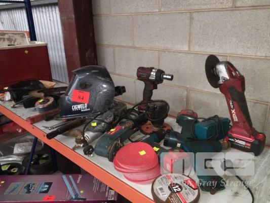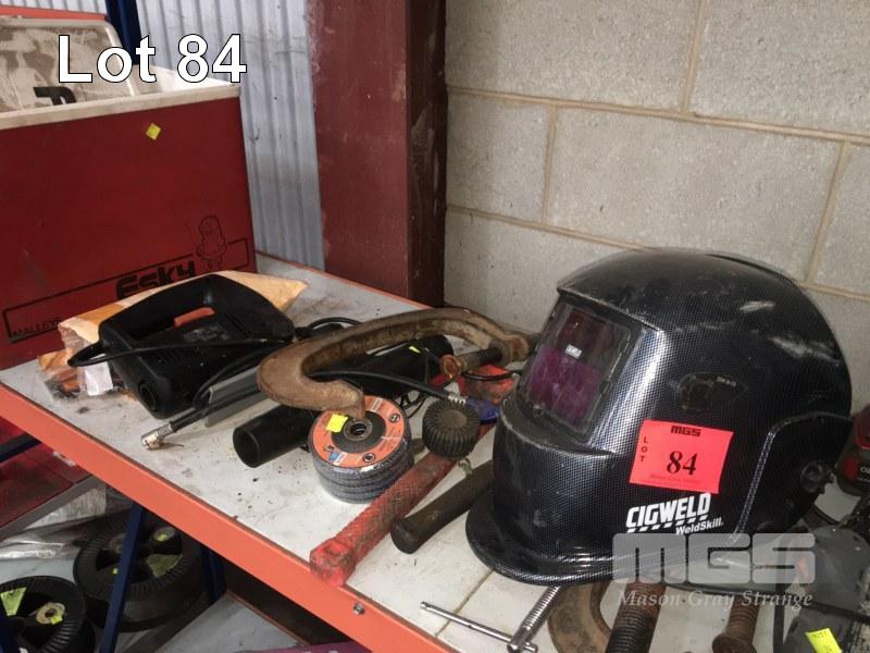 G-CLAMP, SANDING DISCS, TIMING LIGHT, SHOT HAMMER, OZITO CORDLESS GRINDER & IMPACT GUN, ASSORTED SANDERS, AUTO TINT WELDING HELMET, ETC & ESKY 1 x SHELF