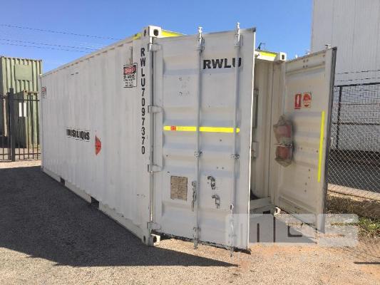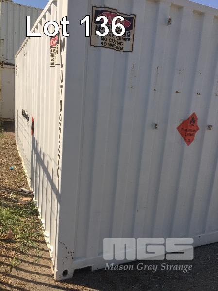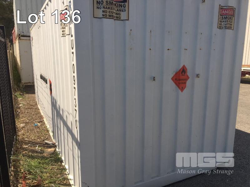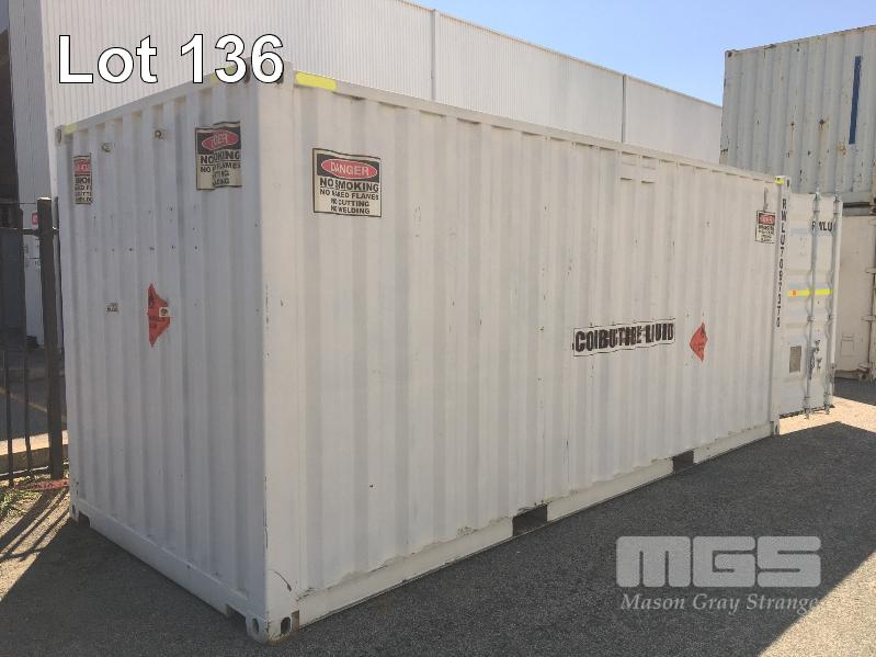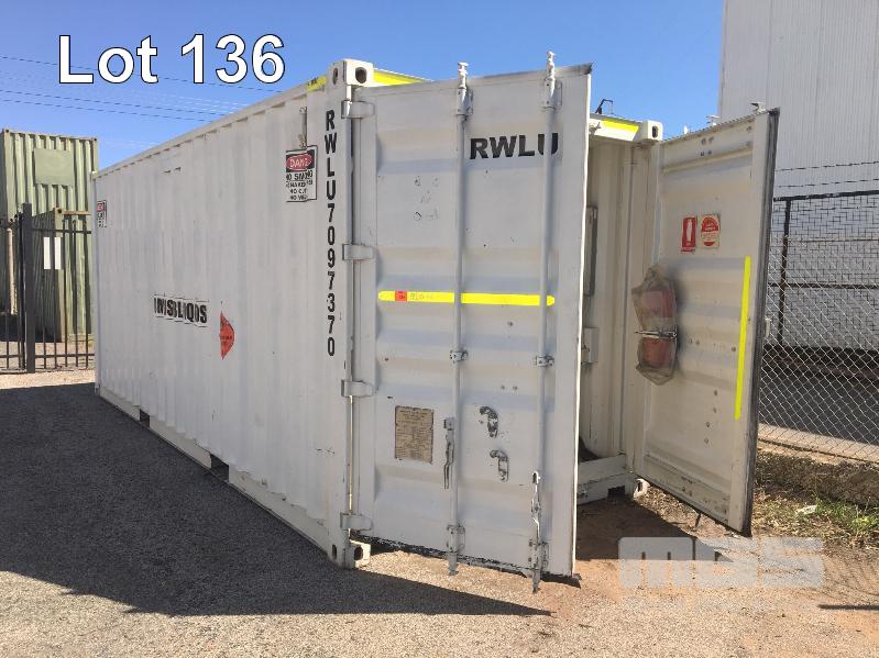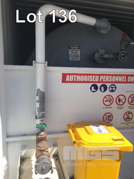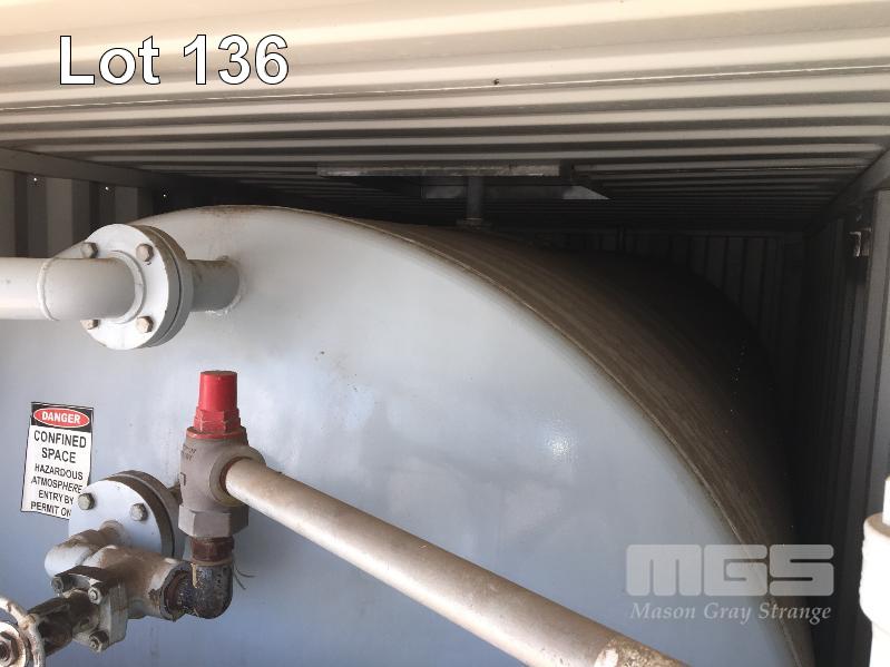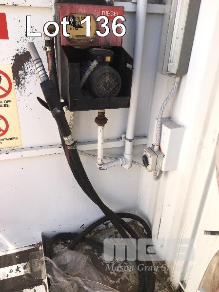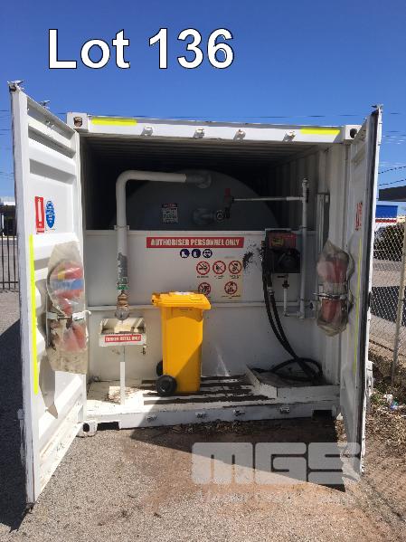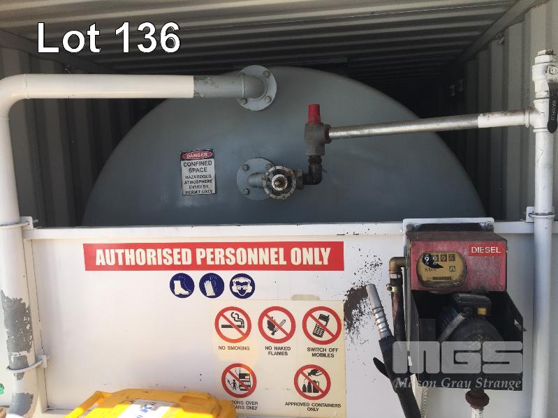 BULK FUEL STORAGE TANK, 16,500 LTS APPROX FITTED IN 20' SHIPPING CONTAINER, WHITE CONTAINMENT BUNDED WITH METERED 240V DIESEL PUMP, HAND TRIGGER & HOSE, SPILL KIT & 2 x FIRE EXTINGUISHERS STEEL CYLINDRICAL TANK, SIZE: 2220 DIAMETER x 4300mm (L) APPROX 3 x TOP FILL INLETS & 1 x SIDE MOUNT OUTLET