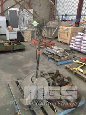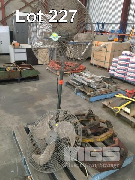 PEDESTAL WORKSHOP FAN, WORKSHOP FAN WITH NO STAND & 4 x 44 GALLON DRUM TROLLEYS, 1 x PALLET