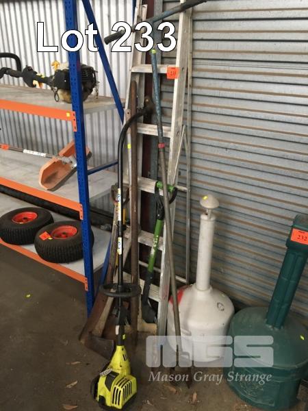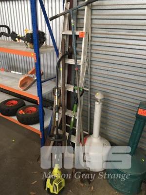 RYOBI LINE TRIMMER, SHOVELS, RAKE, POST DIGGER, MATICK, ETC